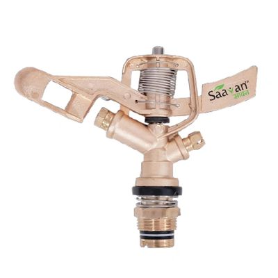Overhead sprinkler with 3/4" BSP/NPT male threaded connection and 27° trajectory angle. Body and arm made of Zinc / aluminium for durability Low volume, fast rotation at low pressure for irrigation of row crops, and smaller nozzles allow low flow & frost protection in vineyards and over trees.